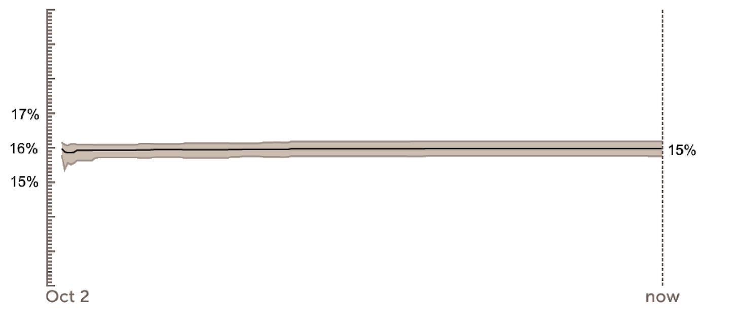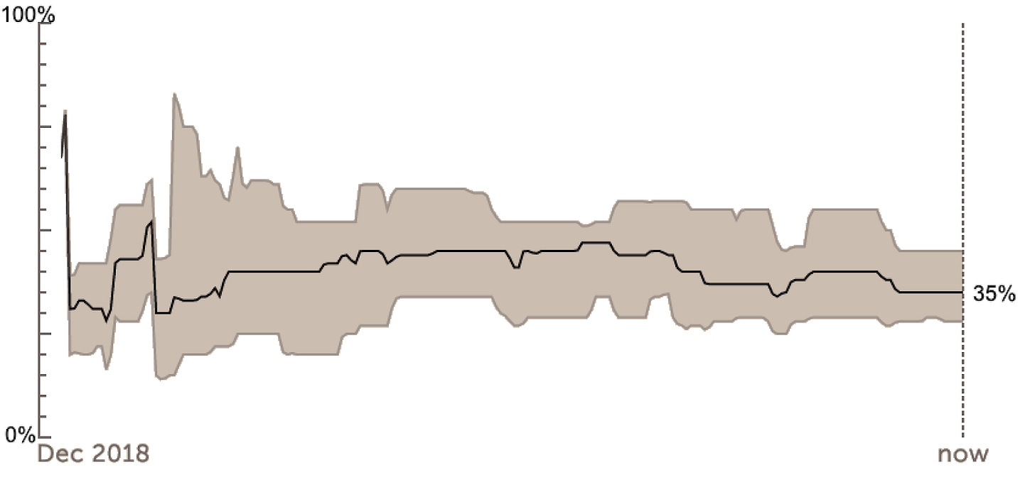 Since issue #3 the forecast [will slaughterhouses be banned in the UK by 2050] has fallen from 20% to 10%. That’s big news, literally halving the chance. There are no comments and the timing makes me wonder if this humble publication had anything to do with it. Regardless, that’s the beauty of forecasting, no one had to write an essay, just a few forecasters got cold feet and pushed their forecasts down. As a result, we get a signal we can see.