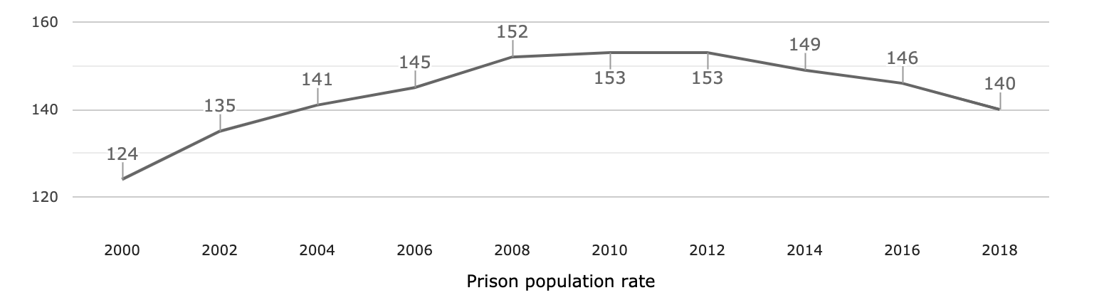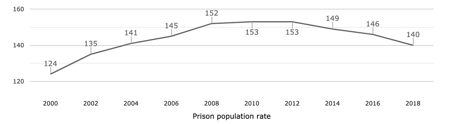 The current prison population is 131 prisoners per 100,000 people. What will it be 5 years after the next election? What if Labour win? What if the Conservatives win?